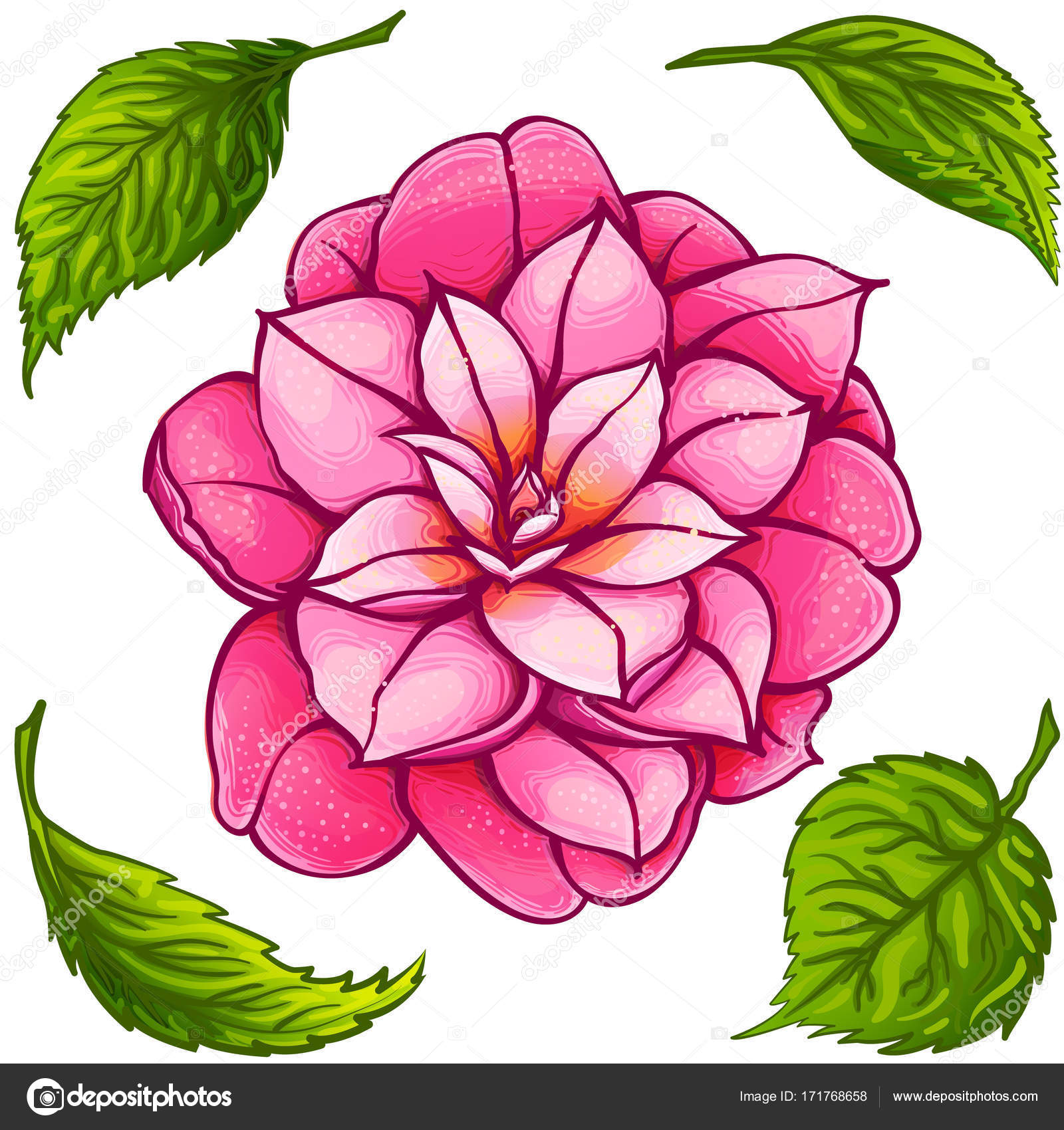 Exotic Flower Camellia With Green Leaves Paradise Pink Flower Stock Vector C Legeida 171768658