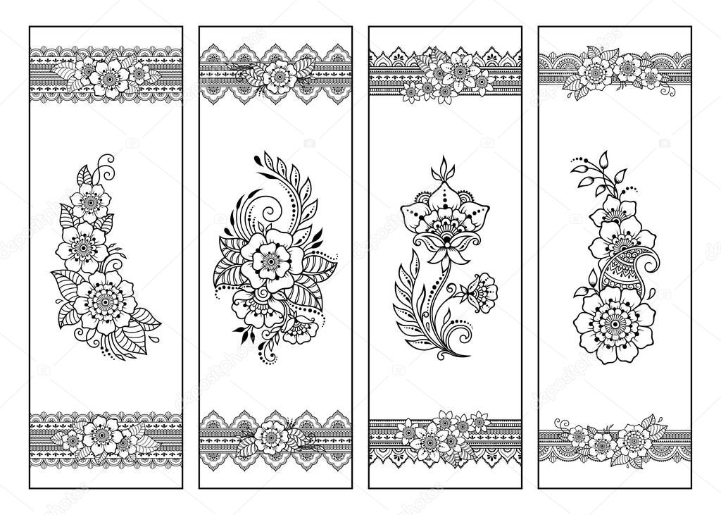 Bookmark For Book Coloring Set Of Black And White Labels With Floral Doodle Patterns Hand Draw In Mehndi Style Sketch Of Ornaments For Creativity Of Children And Adults With Colored