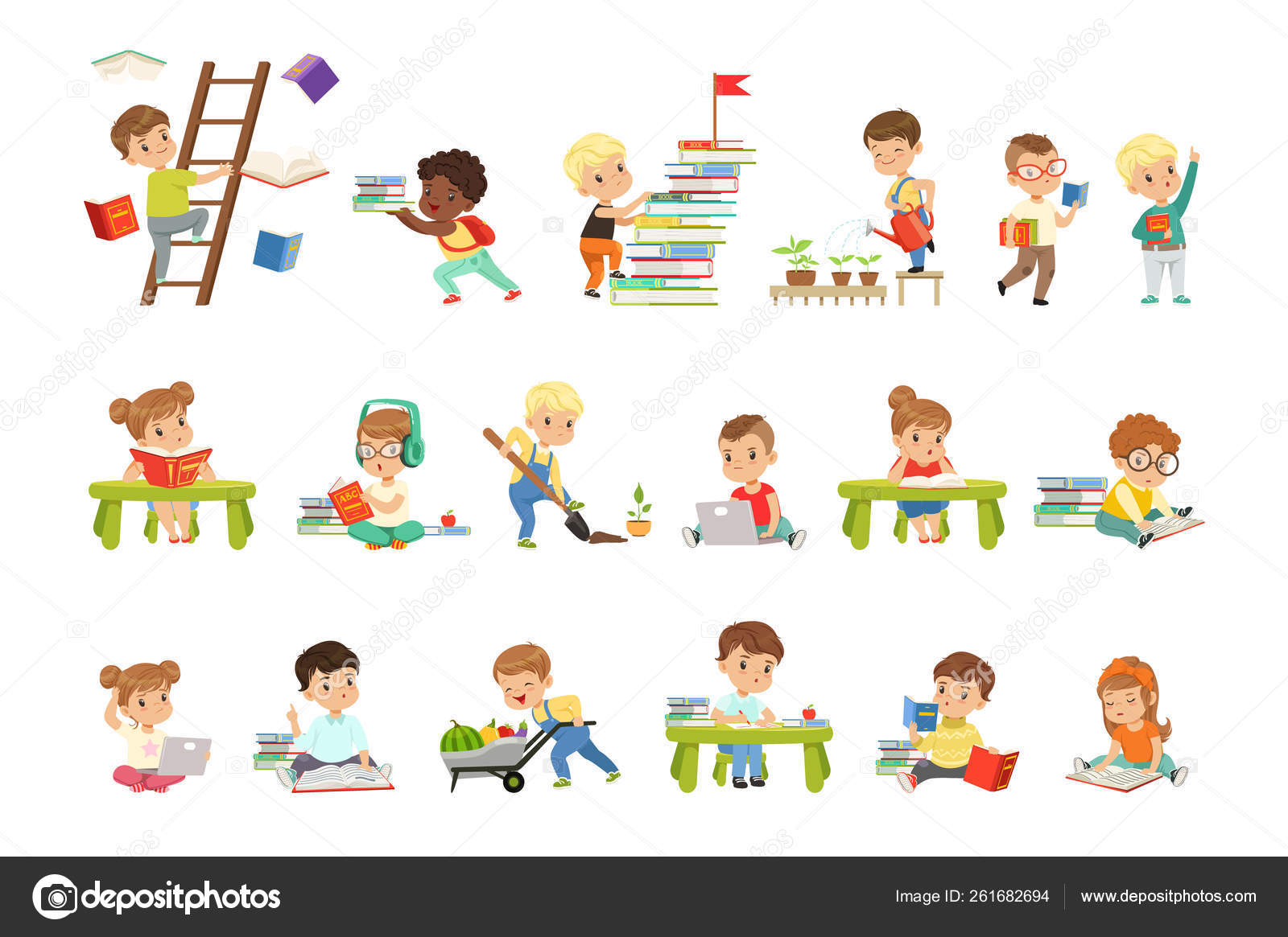 Studying Drawing Reading Children Activities Clipart Collection Kids Playing At School Or Kindergarten Characters Set Stock Vector Illustration Of Friends Activities 182594076