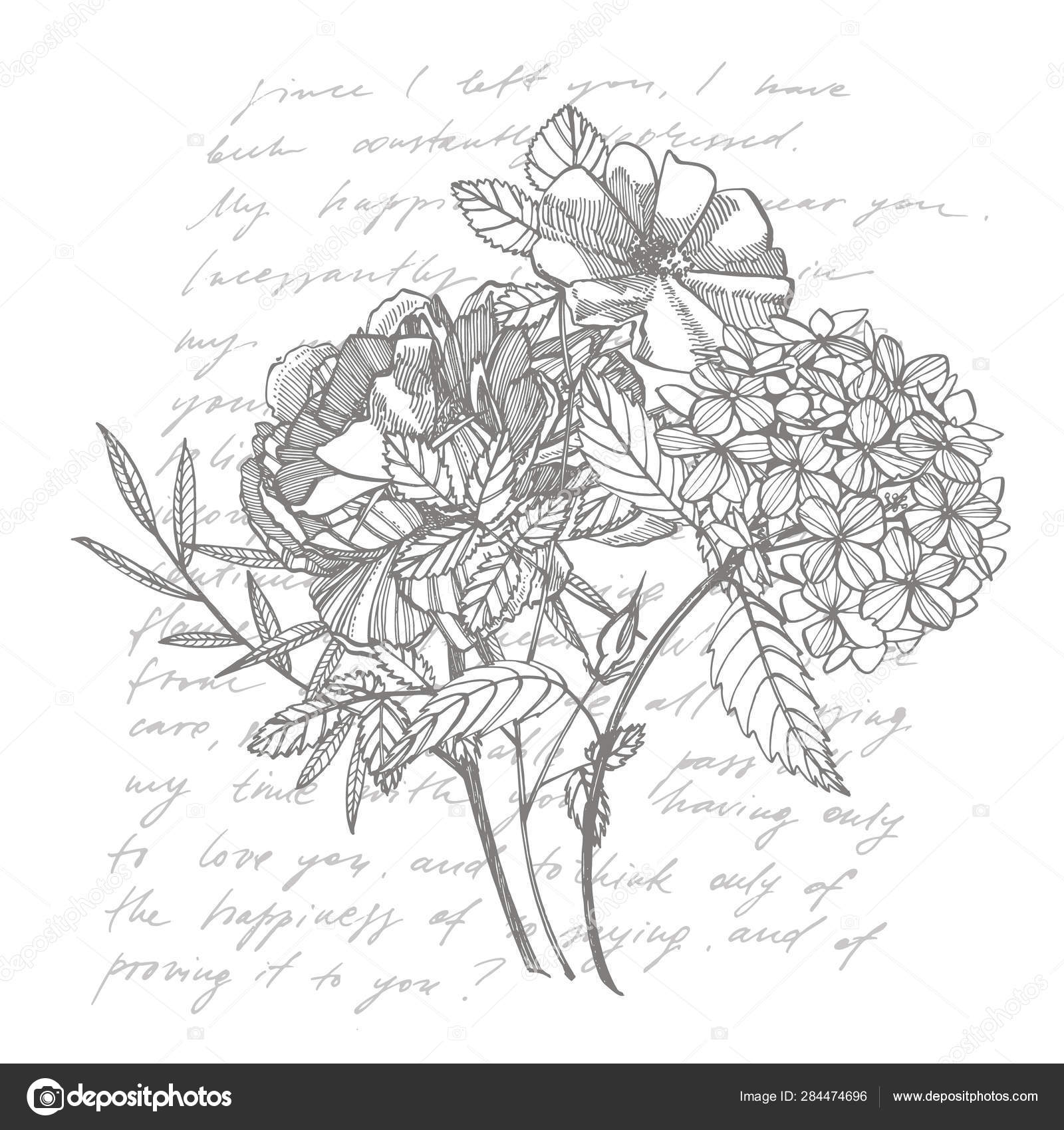 Bouquet Spring Flowers And Twigs Peonies Hydrangea Rose Vintage Botanical Illustration Black And White Set Of Drawing Cornflowers Floral Elements Hand Drawn Botanical Illustration Handwritten Stock Photo C Asetrova 284474696