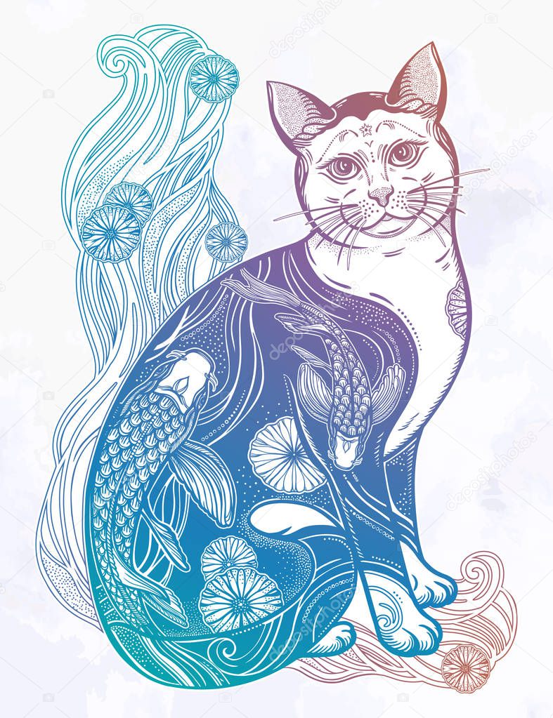 Japanese Cute Cat With Traditional Tattoo Hand Drawn Cat Vector Stock Vector Illustration Of Style Flower 134500545