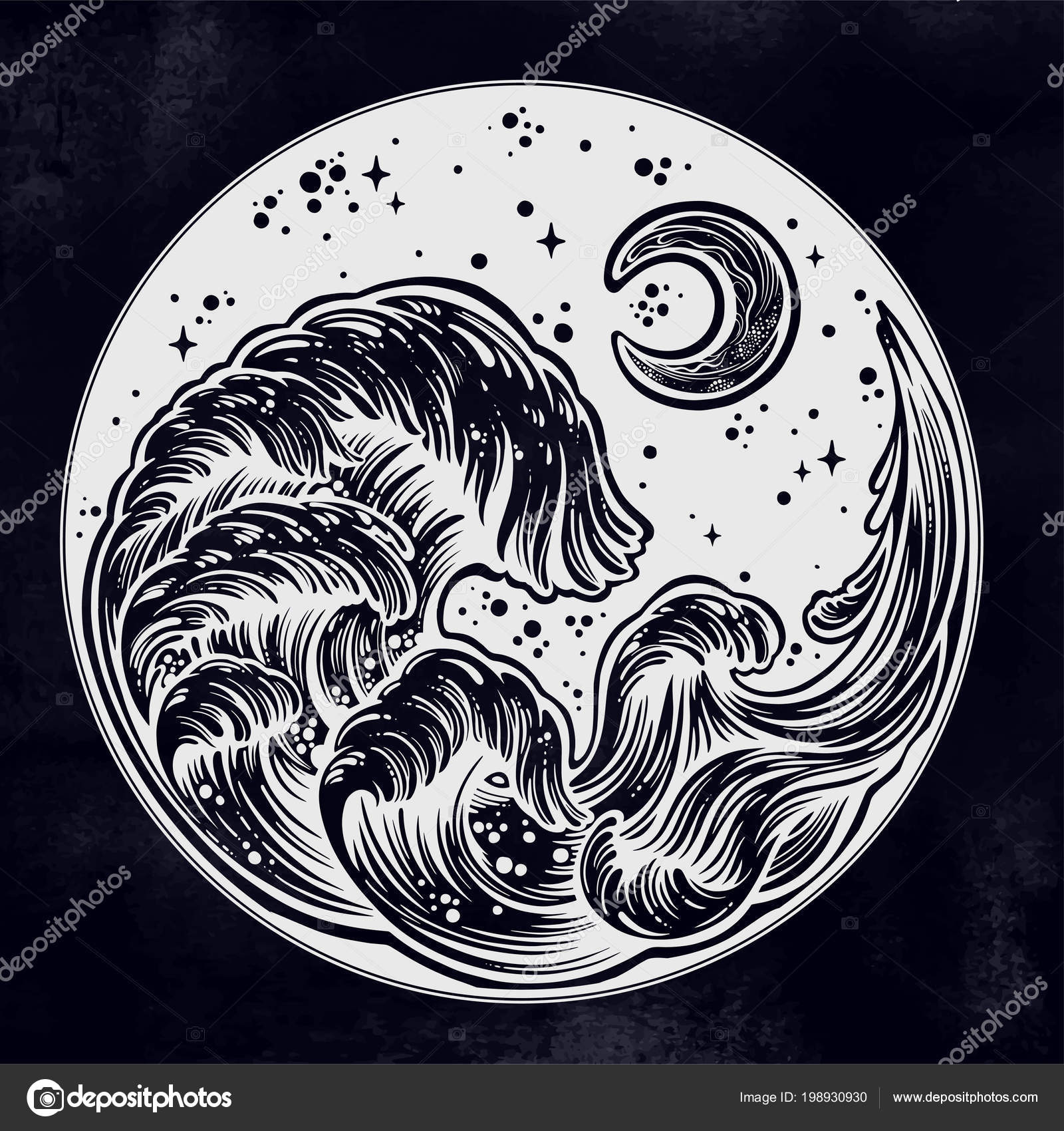 Hand Drawn Water Waves In The Night Stormy Sea With Moon Line Art Drawing Stock Vector C Katja87 198930930